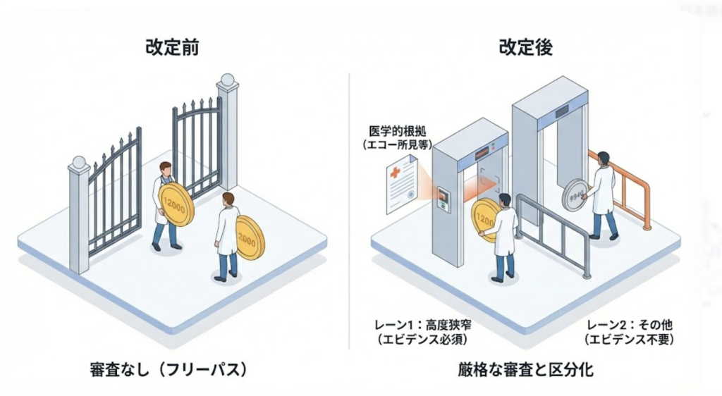 今回の改定の目玉は、これまでの「一律算定」から「エビデンス(医学的根拠)に基づく区分化」への移行です。 これまでは、完全に詰まっている場合でも、予防的に少し広げる場合でも、同じ「12,000点(初回)」でした。しかし2026年からは以下のようになります。
